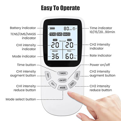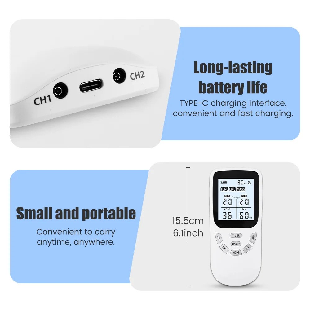 With dual independent channels (CH1 & CH2), you can treat two areas simultaneously—perfect for back and neck, or both legs. Adjust intensity, frequency, and duration easily via the intuitive LCD screen and simple control panel.